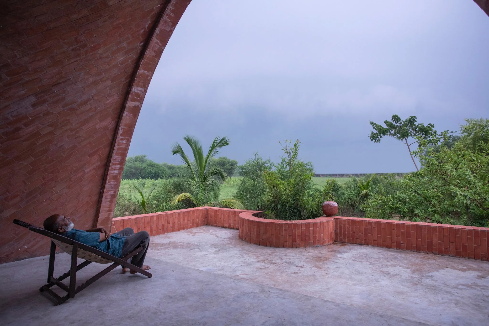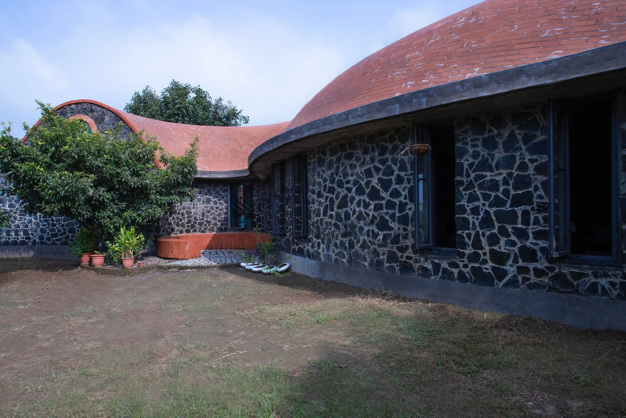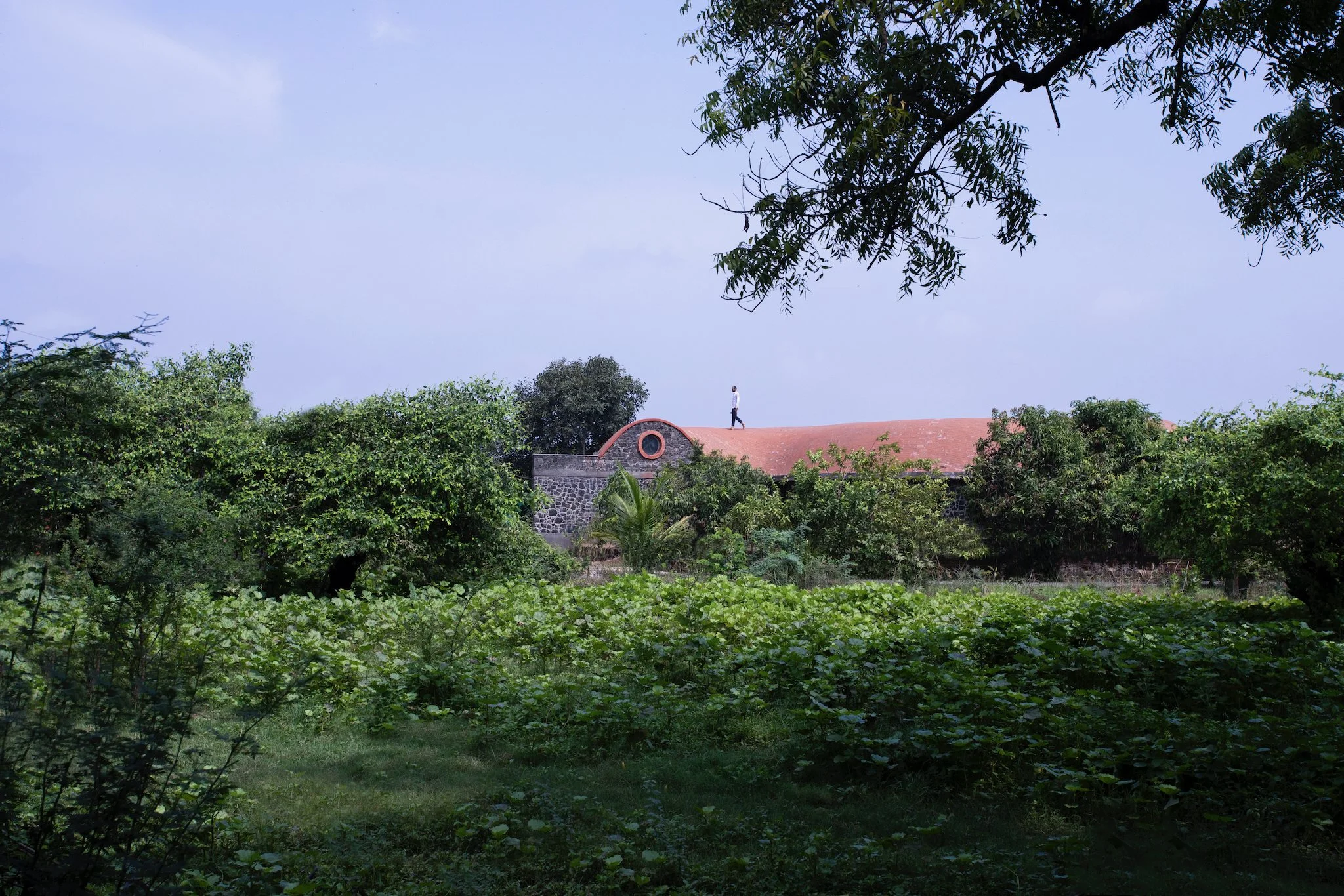 Set on the outskirts of Bharuch, this weekend retreat grows out of the land as much as it rests upon it. The plot came with mature fruit-bearing trees like mango (Mangifera indica), chickoo (Manilkara zapota), and jamun (Syzygium cumini) whose presence defined the layout from the very beginning. Rather than clearing the site, the house was conceived as a curving form that gently weaves around the existing canopy, allowing architecture and landscape to remain in dialogue.