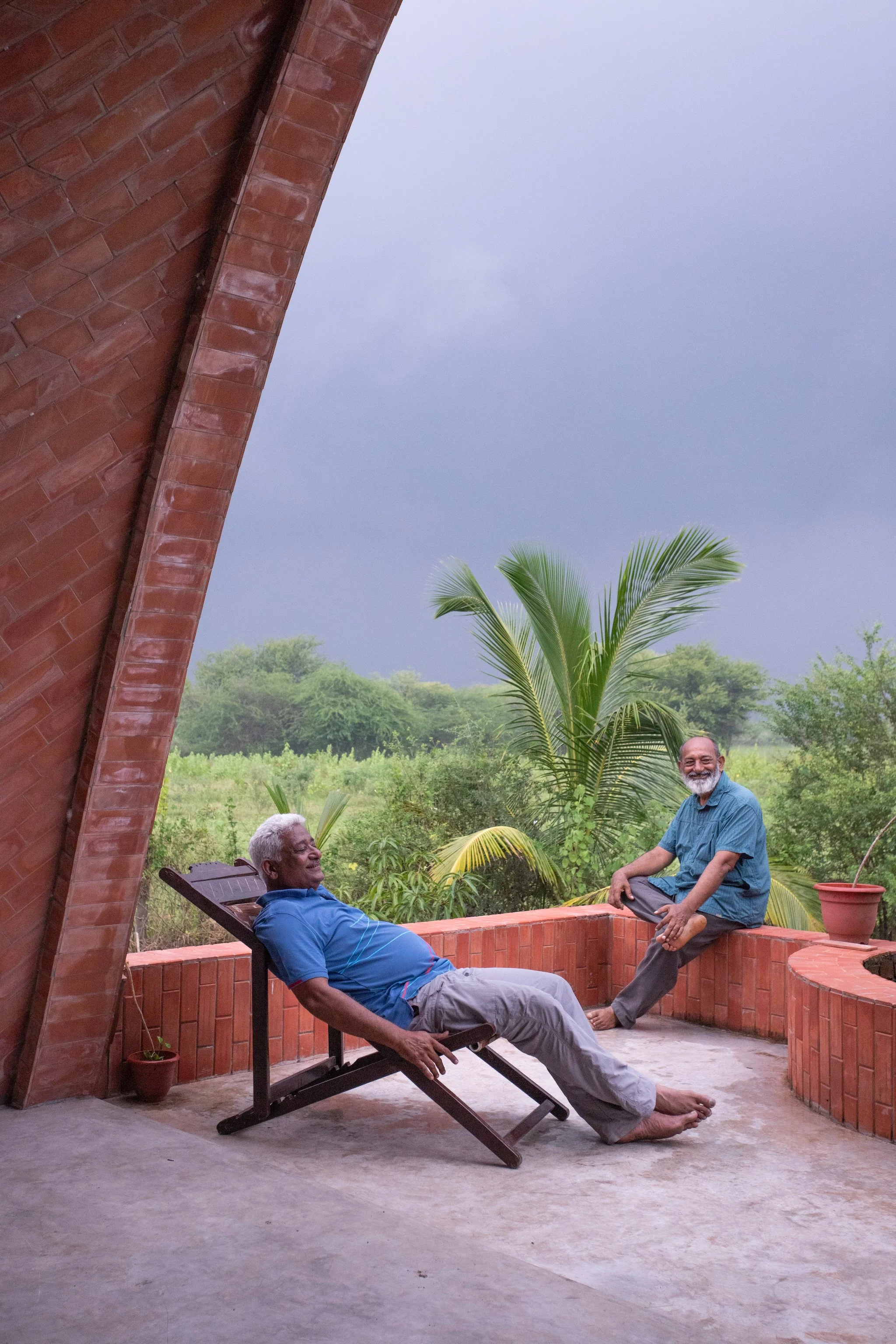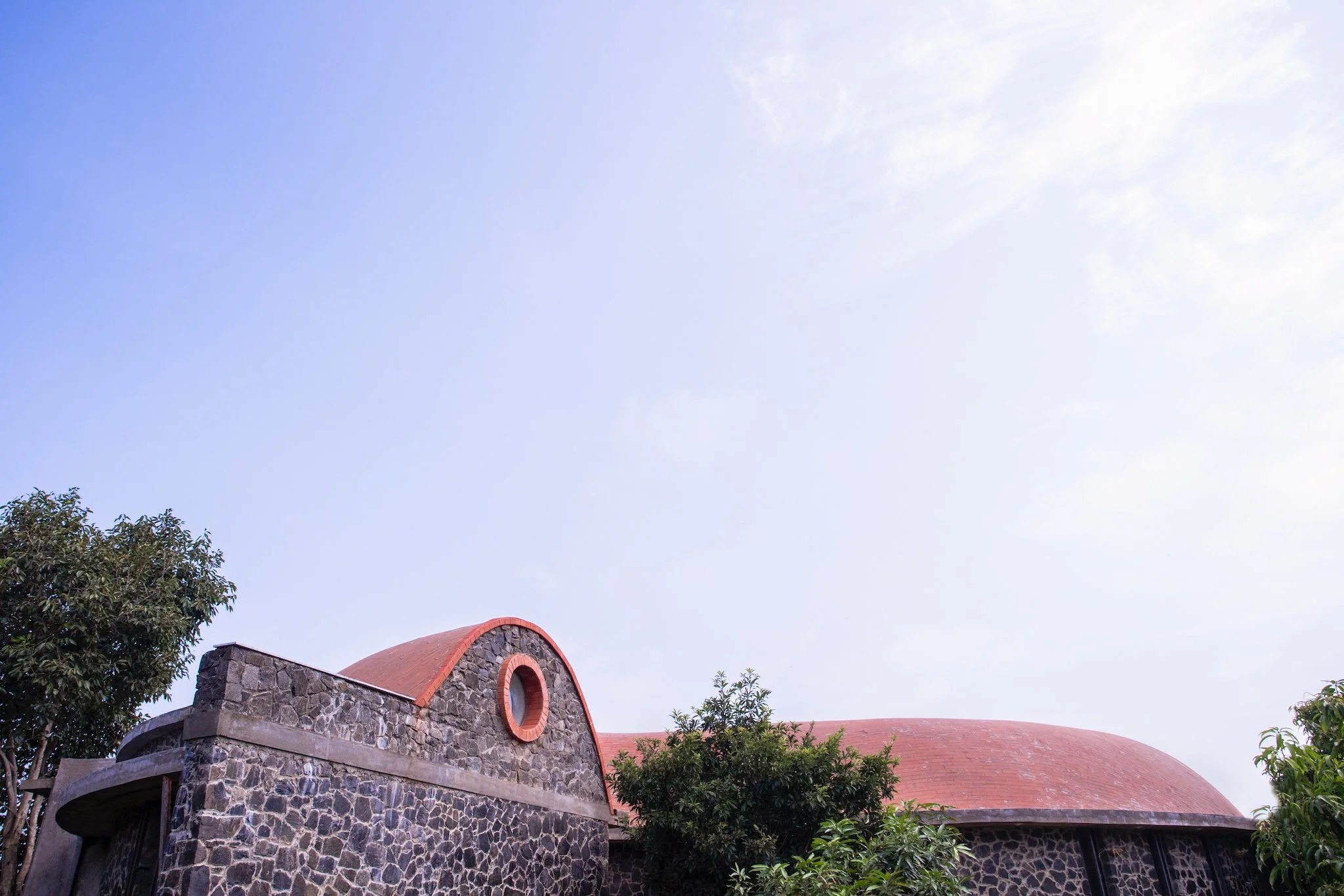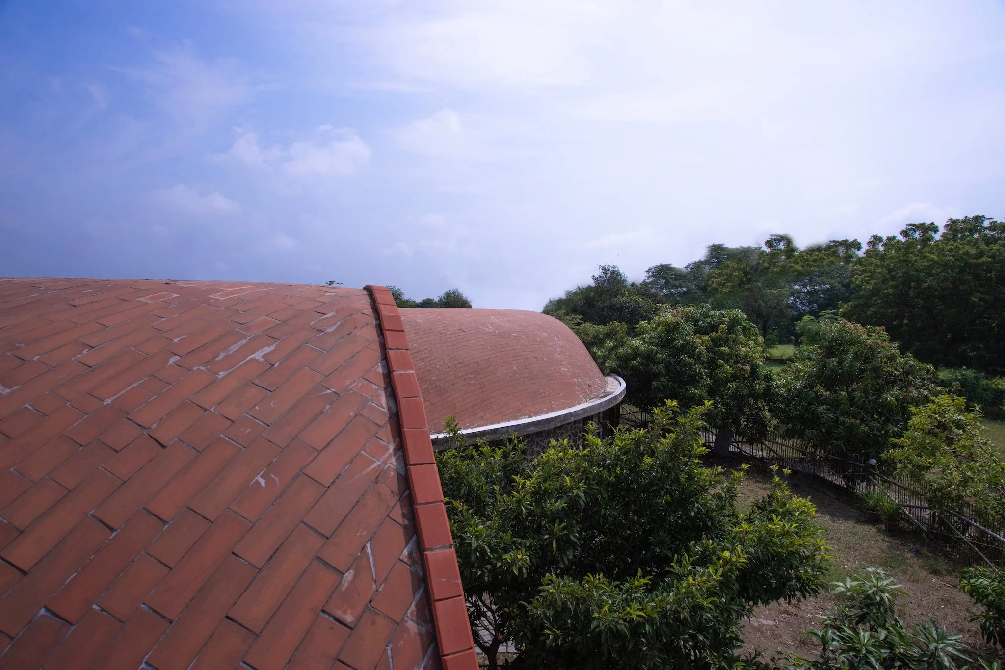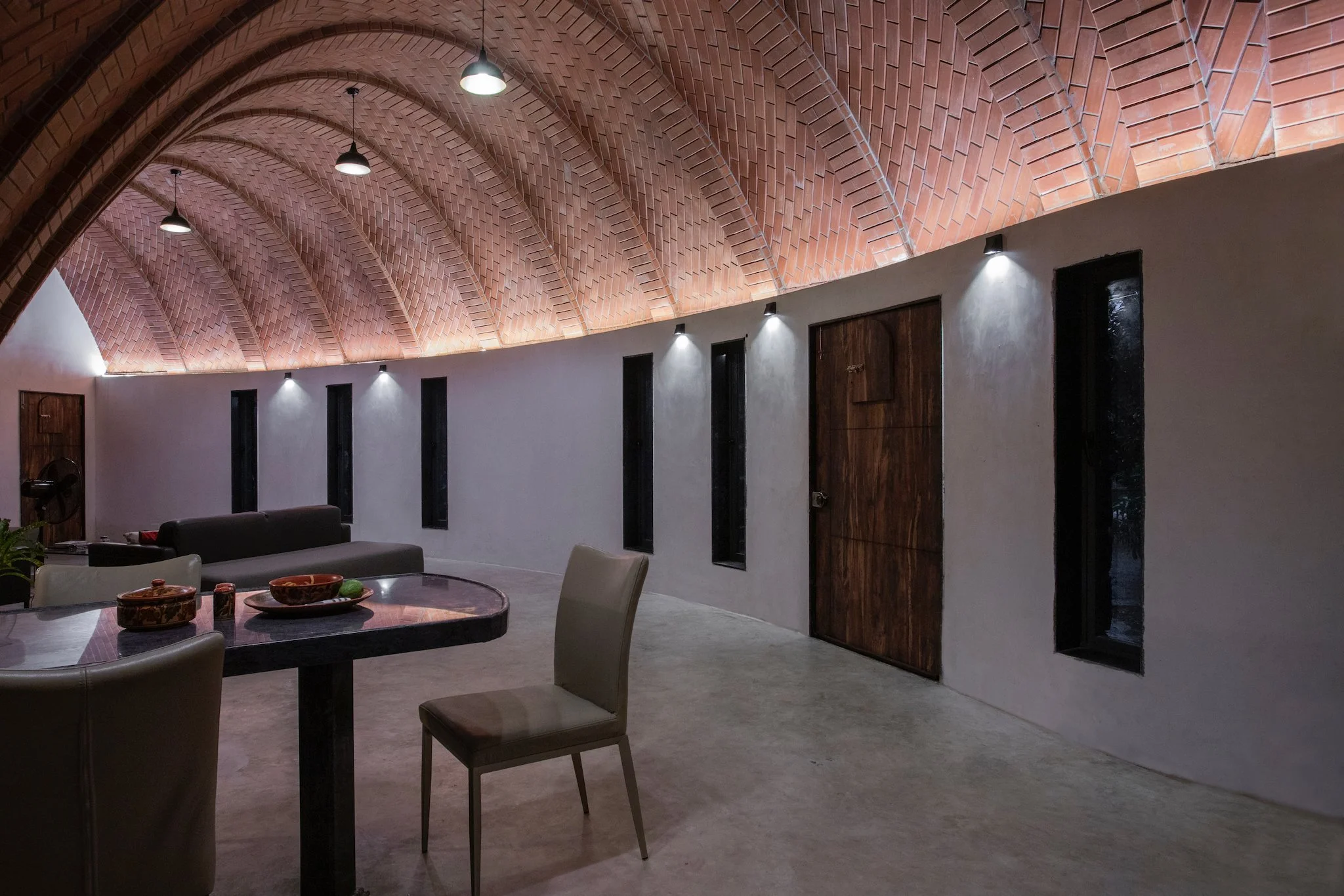 Set on the outskirts of Bharuch, this weekend retreat grows out of the land as much as it rests upon it. The plot came with mature fruit-bearing trees like mango (Mangifera indica), chickoo (Manilkara zapota), and jamun (Syzygium cumini) whose presence defined the layout from the very beginning. Rather than clearing the site, the house was conceived as a curving form that gently weaves around the existing canopy, allowing architecture and landscape to remain in dialogue.