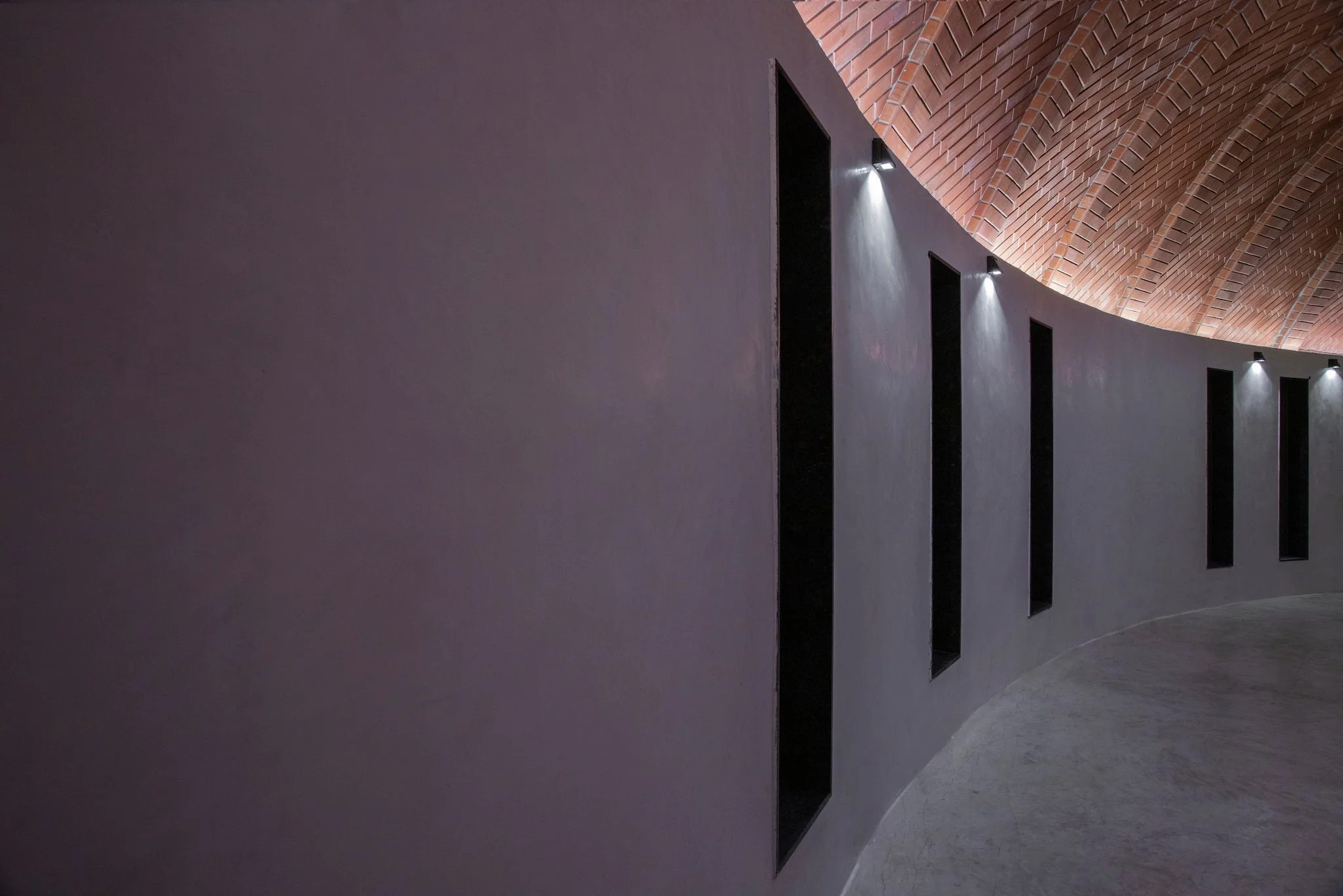 The spaces are defined by its curvilinear Catalan-tile vault, a continuous sweep that rises from the northern end before settling onto thick basalt rubble walls. The rough-hewn stone, with its raw mass and irregularity, grounds the structure, while the vault introduces lightness and fluidity. Inside, a polished lime concrete floor flows seamlessly through the space.